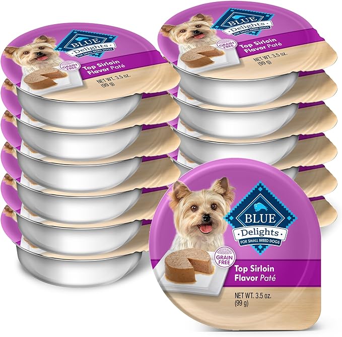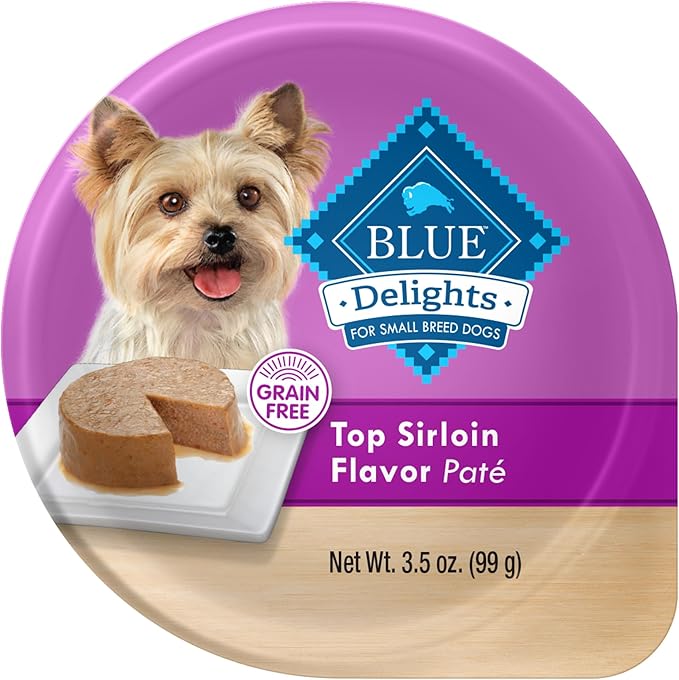 • Contains twelve (12) 3.5-oz BLUE Delights Natural Adult Small Breed Wet Dog Food Cups, Top Sirloin Flavor in Savory Juice