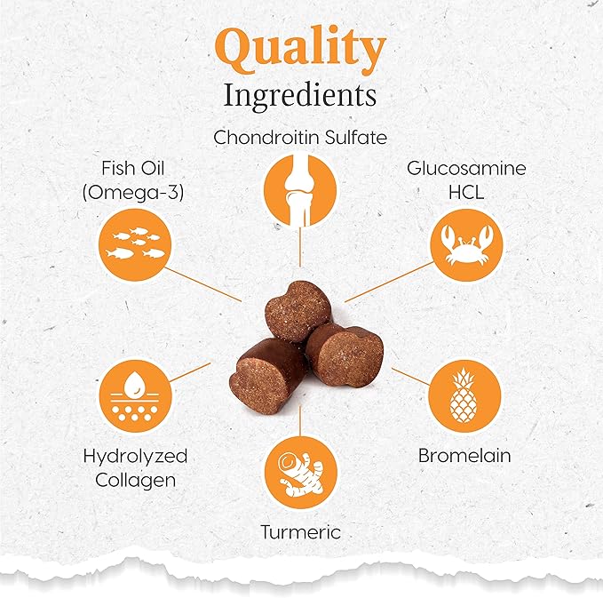 • GLUCOSAMINE & CHONDROITIN: Glucosamine and chondroitin rebuild and repair connective tissue to restore your dogs joint mobility and function while turmeric supports pain relief and reduces inflammation.