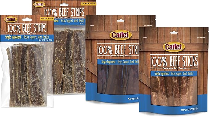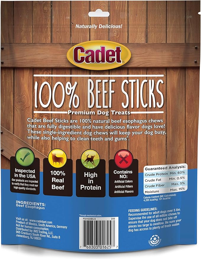 Cadet Beef Sticks Dog Treats - Long-Lasting, Healthy & Natural Beef Esophagus Treats for Small & Large Dogs, Low Calorie & High Protein Dog Chews (12 oz.)