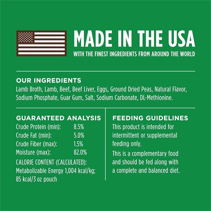• NATURAL WET DOG FOOD TOPPER WITH SAVORY GRAVY: Grain free cuts of grass fed lamb in a savory gravy. Made without grain, potato, corn, wheat, soy, carrageenan, artificial colors or preservatives - ingredients known to trigger food sensitivities.