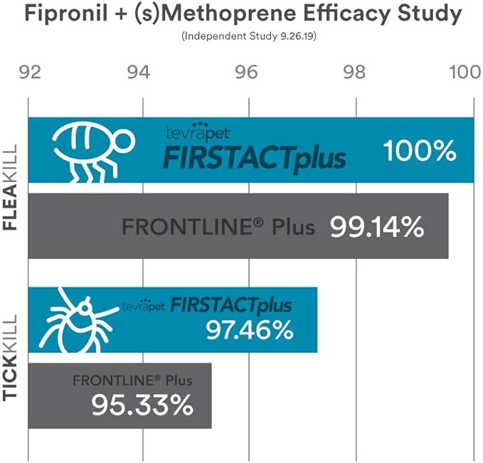 • THE SAME ACTIVE INGREDIENTS AS FRONTLINE - FOR FAR LESS: It's worth repeating: Just like Frontline Plus, FirstAct Plus's powerful active ingredients REPEL and KILL fleas and ticks on contact and stop reinfestations. At TevraPet we firmly believe you shouldn't have to pay the "Brand tax" to protect your dog, and we are committed to providing affordable, veterinarian quality solutions without sacrificing an ounce of safety, effectiveness, or reliability