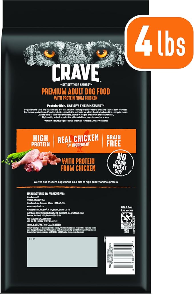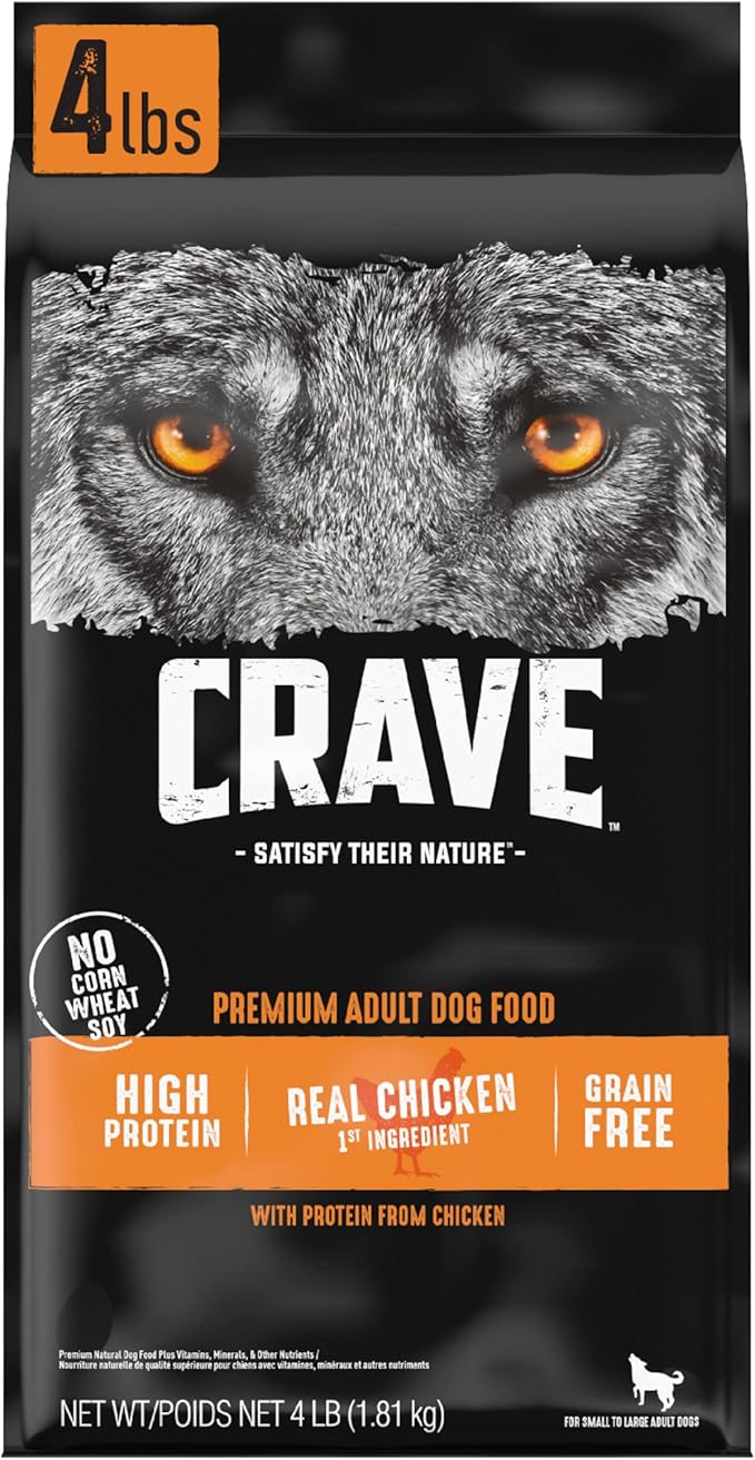 • Contains one (1) 4 lb. bag of CRAVE Grain Free Adult Dry Dog Food with Protein from Chicken—for any size dog