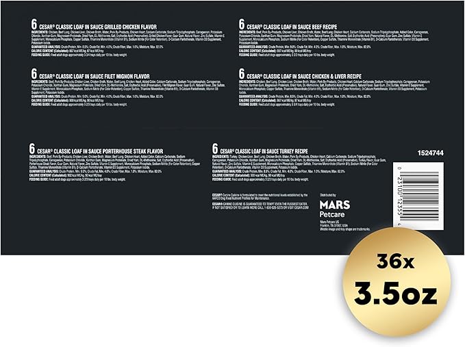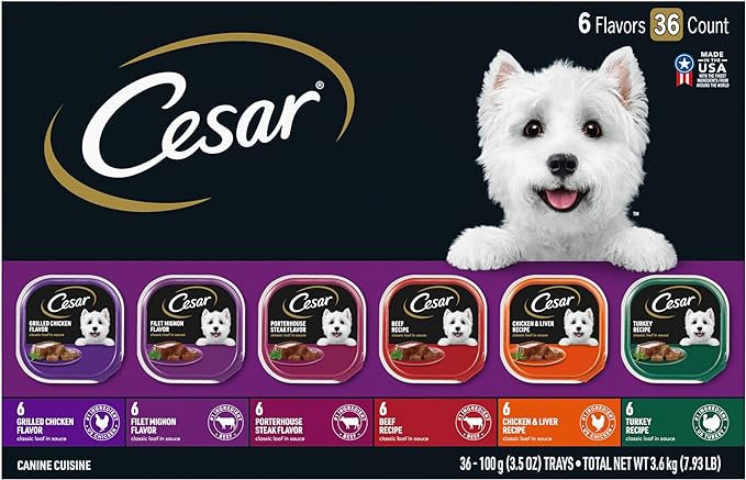 • Contains thirty-six (36) 3.5 oz. easy peel trays of CESAR Wet Dog Food Classic Loaf in Sauce Grilled Chicken, Filet Mignon, Porterhouse Steak, Beef, Chicken & Liver and Turkey Variety Pack