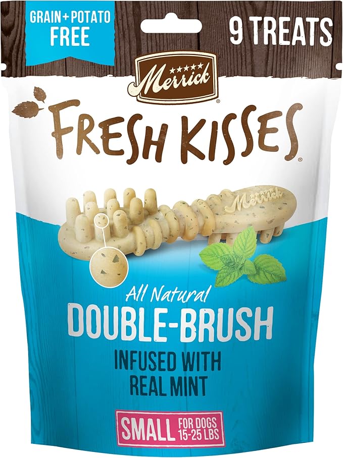 • Merrick Fresh Kisses Infused With Real Mint, Natural Toothbrush-Shaped Dental Dog Chews For Small Dogs Weighing 15-25 Lbs