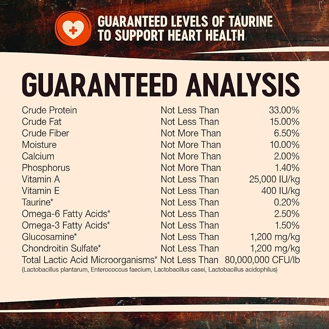 • SUPPORTS HEALTHY COAT & HEART: Guaranteed levels of omega fatty acids from ingredients such as flaxseed and salmon oil support healthy skin and coat, glucosamine for strong joints, probiotics for digestive health and taurine for a healthy heart.