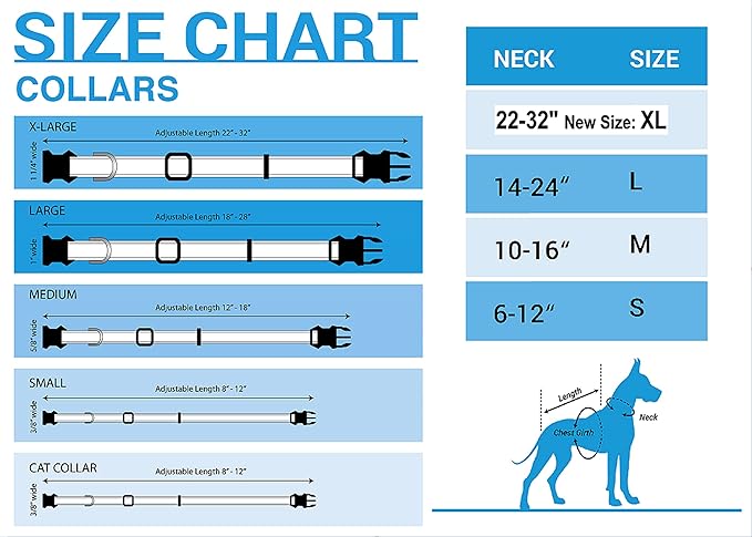 • Our officially licensed collars fit every shape and size. Measure your dog's neck according to the size chart in the image. Small: 3/8" Wide X 8-12" Long, Medium: 5/8" Wide X 12-18" Long, Large: 1" Wide X 18-28" Long