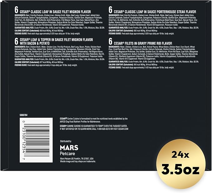 • Contains twenty-four (24) 3.5 oz. easy peel trays of CESAR Wet Dog Food Steak Lovers Variety Pack with Real Meat