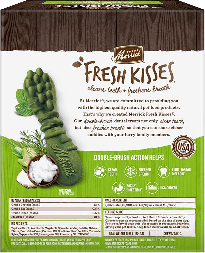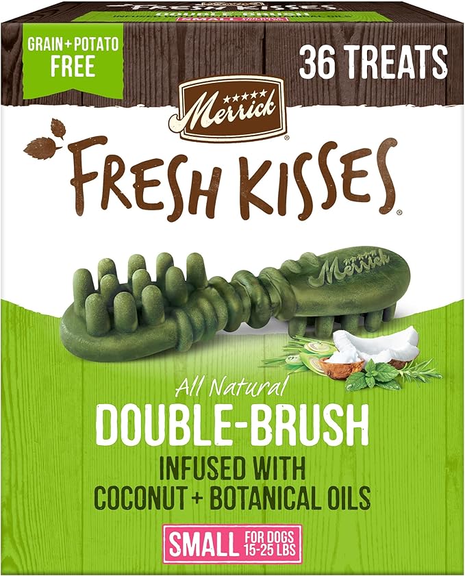 • Merrick Fresh Kisses Infused With Coconut And Botanical Oils, Natural Toothbrush-Shaped Dental Dog Chews For Small Dogs Weighing 15-25 Lbs