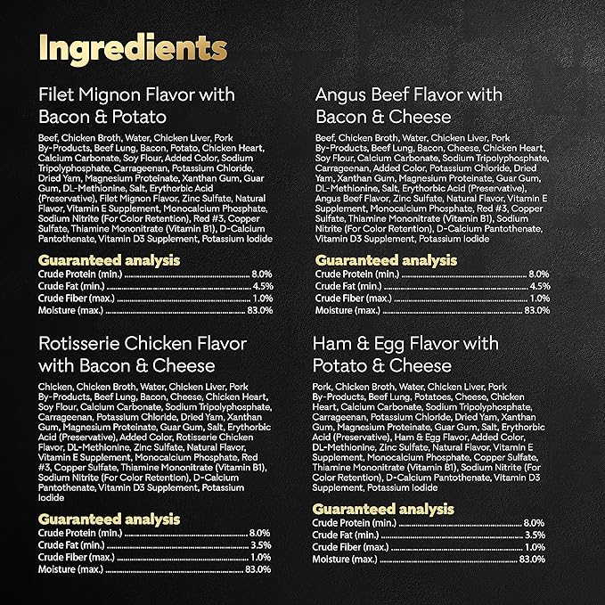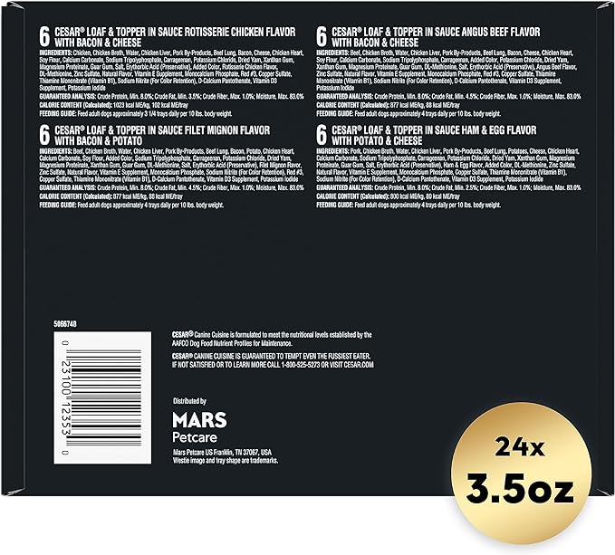• Contains one (1) 24 count case of 3.5 oz. trays of CESAR Loaf & Topper in sauce Wet Dog Food Variety: (6) Rotisserie Chicken with Bacon & Cheese, (6) Filet Mignon with Bacon & Potato, (6) Beef with Bacon & Cheese, and (6) Ham & Egg with Potato & Cheese
