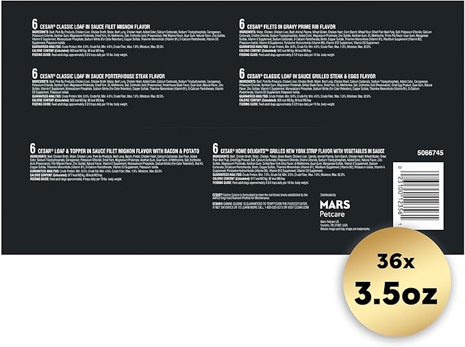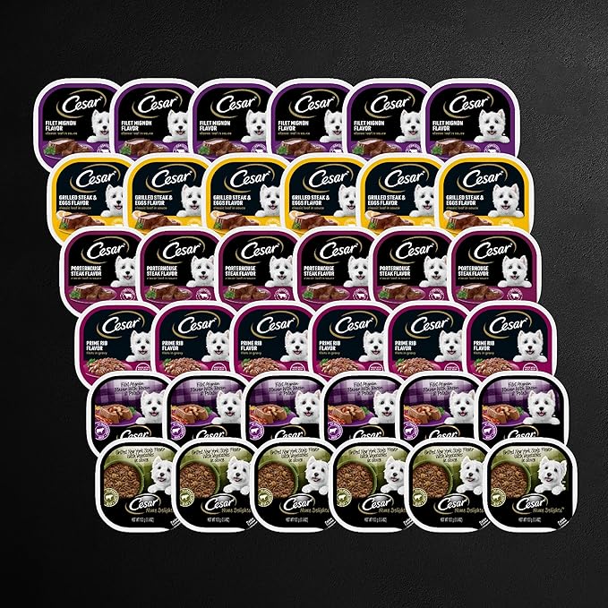 • Contains thirty-six (36) 3.5 oz. easy peel trays of CESAR Wet Dog Food Steak Lovers Variety Pack with Real Meat