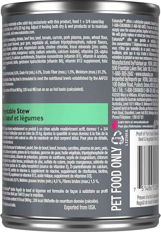 • Contains (12) 12.5-oz. cans of EUKANUBA Beef & Vegetable Stew Canned Dog Food