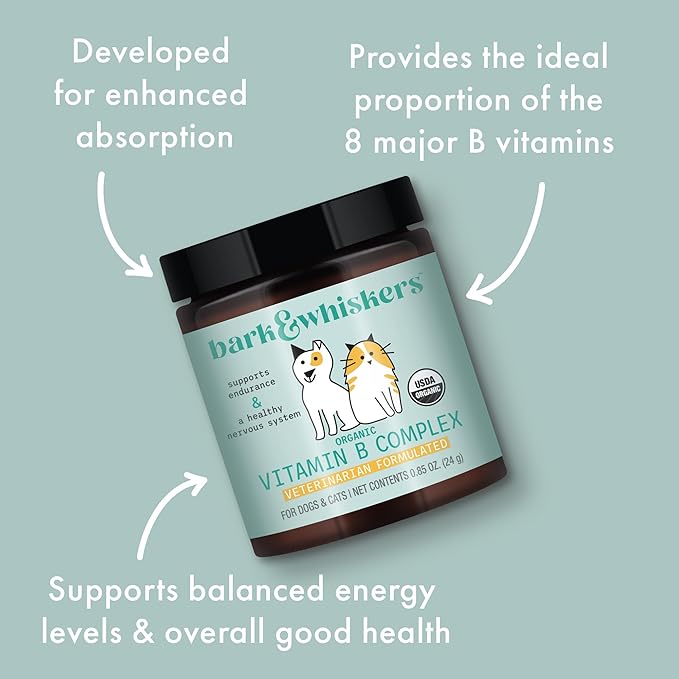 • Bark & Whiskers Organic Vitamin B Complex is an advanced blend of the 8 major B vitamins in their ideal proportions, providing your cat or dog with foundational support for multiple body systems and essential functions