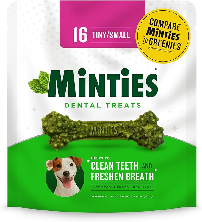 Minties Dental Chews for Dogs, 16 Count, Vet-Recommended Mint-Flavored Dental Treats for Tiny/Small Dogs 5-24 lbs, Dental Bones Clean Teeth, Fight Bad Breath, and Removes Plaque and Tartar