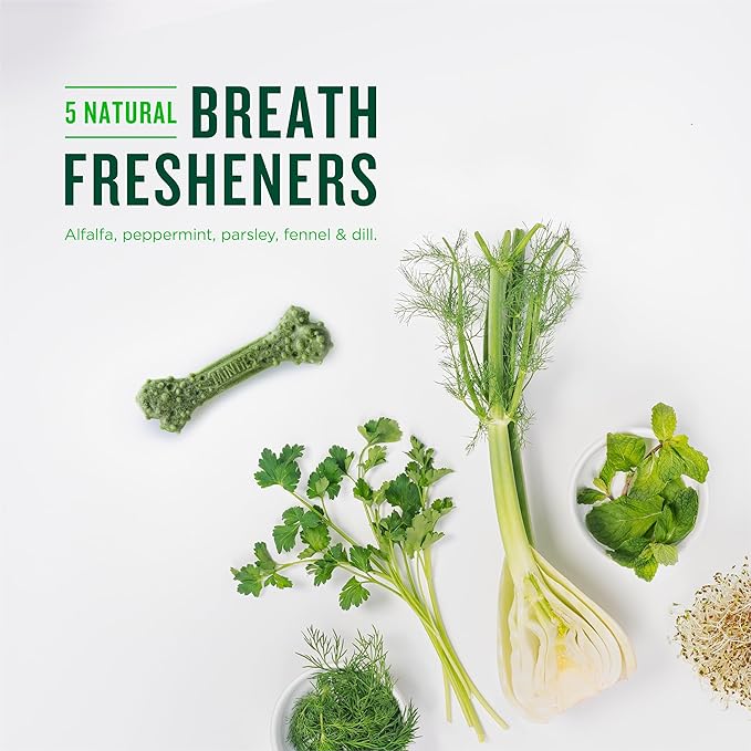 • Promote Good Dog Oral Health: Using Minties dog dental chews daily helps promote oral health and freshens your dog's breath with five (5) breath fresheners alfalfa, parsley, fennel dill, and peppermint