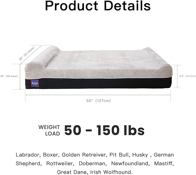 • Extra Large Bed 50"L x 36"W x 10"H dimensions for dogs 200 pounds and under. Laifug foam bed will become your pets favorite sleeping spot