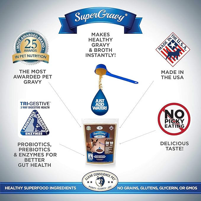 • SuperGravy is far more than a delicious gravy; our proprietary Trigestive Complex brings the energy of raw pet food to any food with active probiotics, prebiotics, and digestive enzymes for gut & immune health