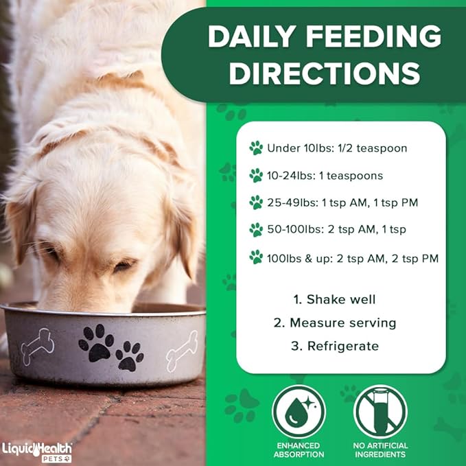 • PERFECT FOR DOGS ALL AGES AND ALL SIZES - Our liquid dog glucosamine hip and joint juice formula is suitable for dogs of all breeds, all ages, and all weights including small dogs and large breeds. Follow the serving size and feeding instructions on our Liquid Health K9 Glucosamine bottle for the best results! We recommend giving your dog their doses of K9 Glucosamine with food or shortly after their meals and refrigerate after use.