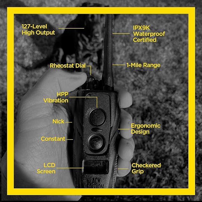 • PRECISE CONTROL: With 127 stimulation levels, you’ll have no problem finding the perfect level for your dog with the gradual and precise stimulation control. The LCD screen is bright and easy to read while the levels can be adjusted precisely at any time with the Rheostat Dial.