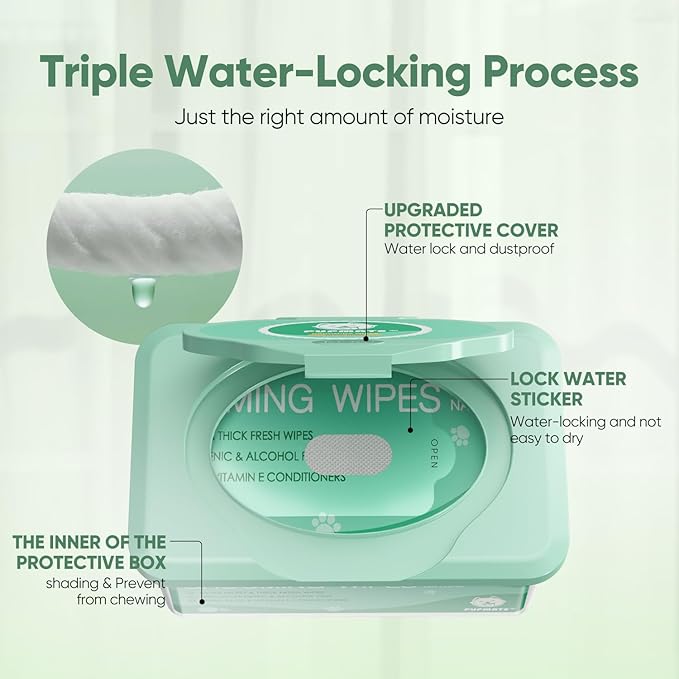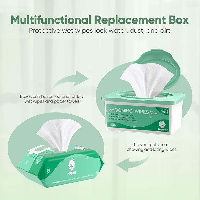 • CONVENIENT STORAGE AND DISTINCTIVE BOX DESIGN: The PUPMATE experience is about convenience, and our pet wipes exemplify this principle. Encased in a moisture-sealed box that shields them from dust and light, they're primed for use at a moment's notice. Be it your adventures outdoors or cozy moments at home, our dog wet wipes take on the role of unwavering protectors, an indispensable resource for your pet's joy.