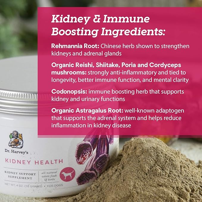 • Herbal and mushroom whole food supplement designed to help support your dog’s kidneys. All natural, with NO synthetic ingredients.