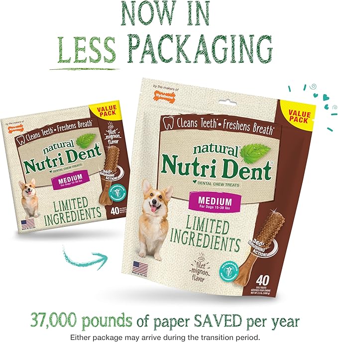 Nylabone Nutri Dent Dog Dental Treats - Natural Dog Teeth Cleaning & Breath Freshener - Dental Treats for Dogs - Filet Mignon Flavor, Medium (40 Count)