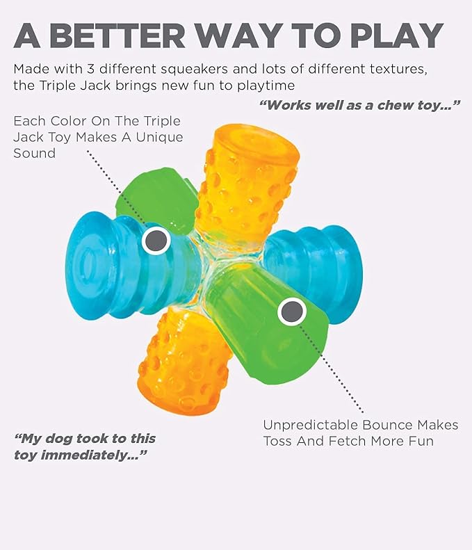 • TRIPLE THE SQUEAKS=TRIPLE THE FUN: The Triple Jack dog toy grunts, squeaks, and squawks depending on which color peg your pup bites down on. Your dog will love discovering these silly sounds as they play!