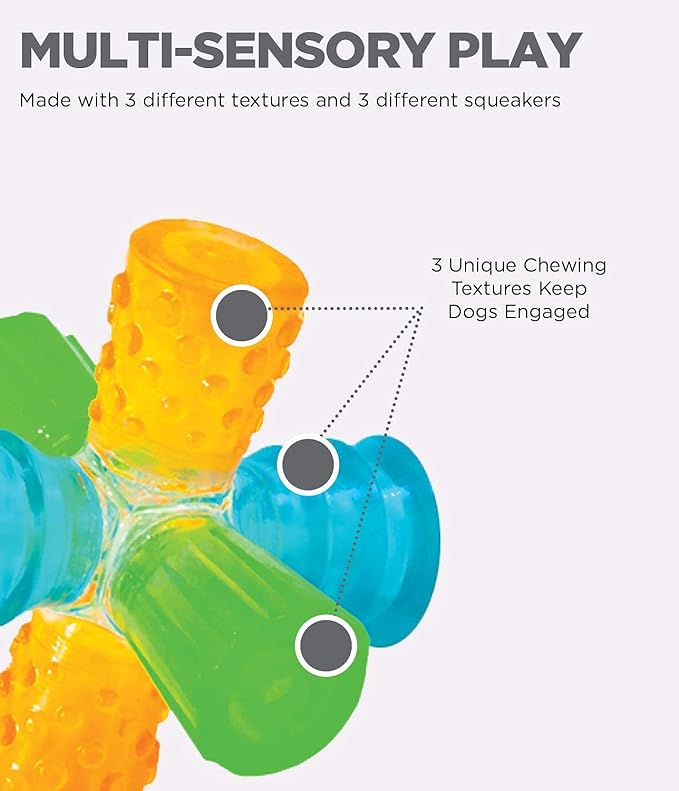 • MULTI-TEXTURED TO SUPPORT GUM HEALTH: Each color of the Triple Jack dog toy corresponds to a different ribbed texture that is enticing and tough, yet also gentle on your dog's gums.