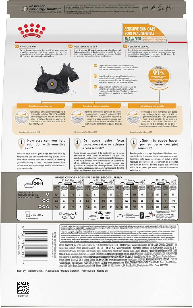 • TAILORED FOR DRY COATS: Royal Canin Small Sensitive Skin Care Dry Dog Food is formulated for small dogs 10 months and older weighing up to 22 lb with sensitive skin and dry coats