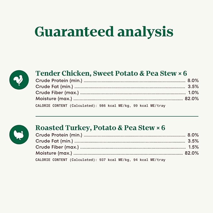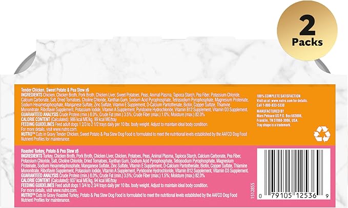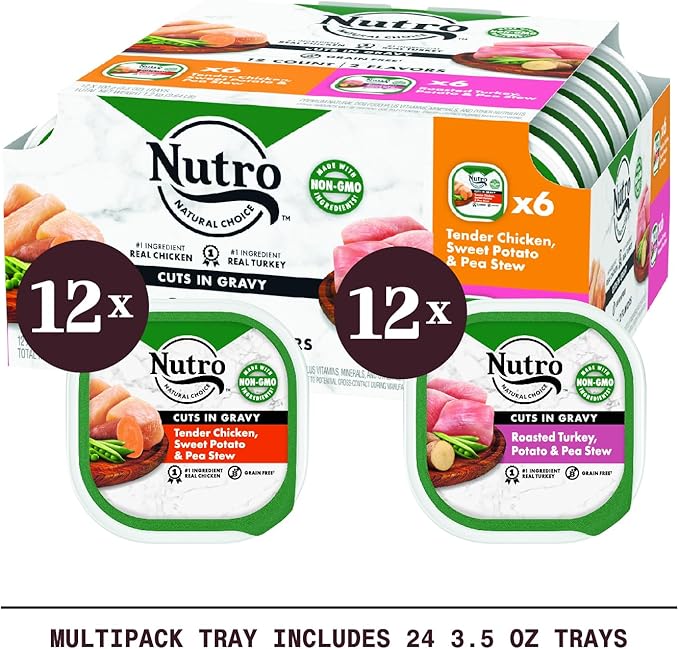 • Variety Pack of 12 Trays: Contains six (6) 3.5 oz. easy peel trays of NUTRO Adult Natural Grain Free Wet Dog Food Cuts in Gravy Tender Chicken, Sweet Potato & Pea Stew Recipe and six (6) 3.5 oz. easy peel trays of Roasted Turkey, Potato & Pea Stew Recipe
