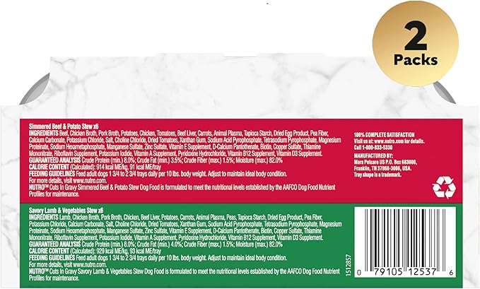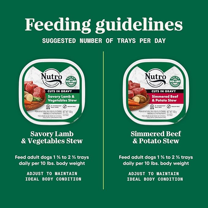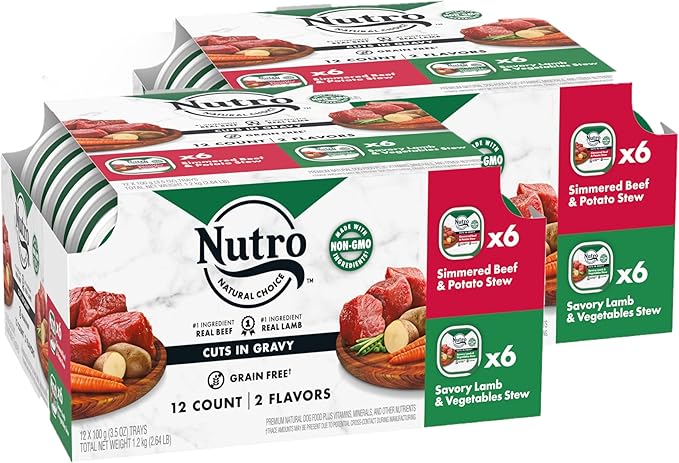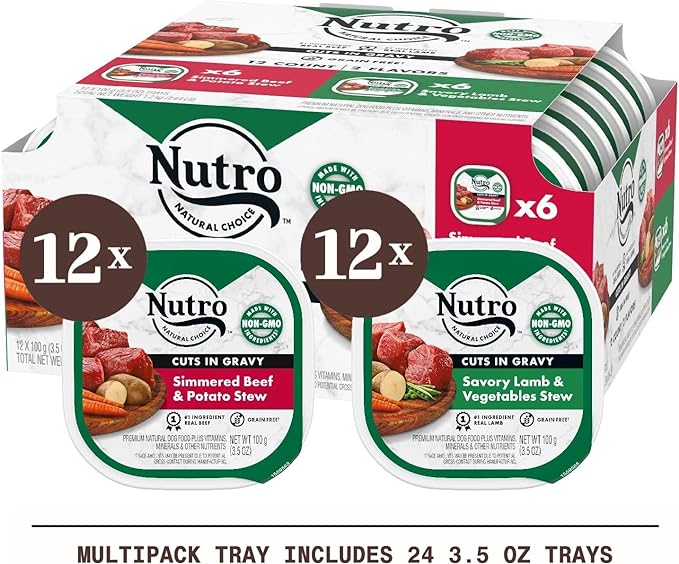 • Variety Pack of 12 Trays: Contains six (6) 3.5 oz. easy peel trays of NUTRO Adult Natural Grain Free Wet Dog Food Cuts in Gravy Tender Chicken, Sweet Potato & Pea Stew Recipe and six (6) 3.5 oz. easy peel trays of Roasted Turkey, Potato & Pea Stew Recipe