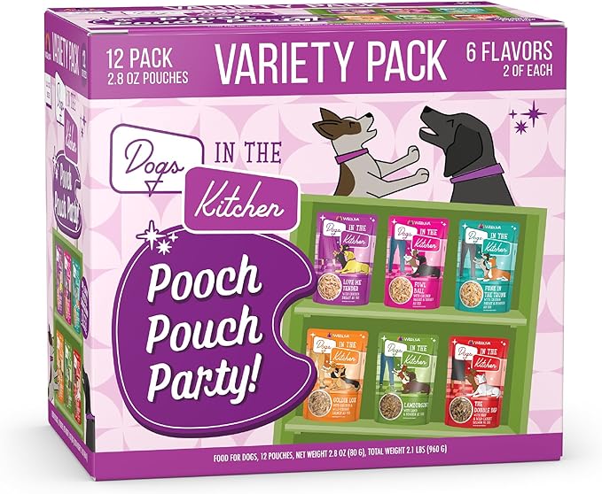 Weruva Dogs in The Kitchen, Variety Pack, Pooch Pouch Party!, Wet Dog Food, 2.8Oz Pouches (Pack of 12)