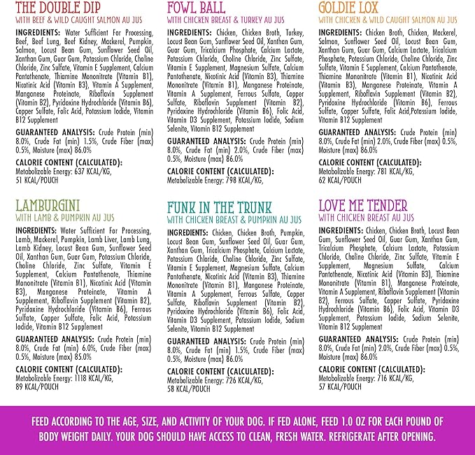 • Pooch Pouch Party Variety Pack (2.8oz Pouches, Pack of 12) A variety pack featuring cage-free chicken, wild-caught salmon, grass-fed beef and lamb. Sure to please even the pickiest pups!