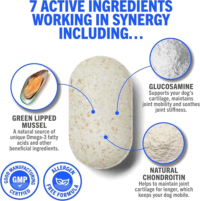 • NATURAL INGREDIENTS - Only the best ingredients; glucosamine for dogs alongside green lipped mussel (natural chondroitin), hyaluronic acid and Magnesium Stearate. Our dog hip and joint supplement also provides vitamin C, vitamin E and Manganese.