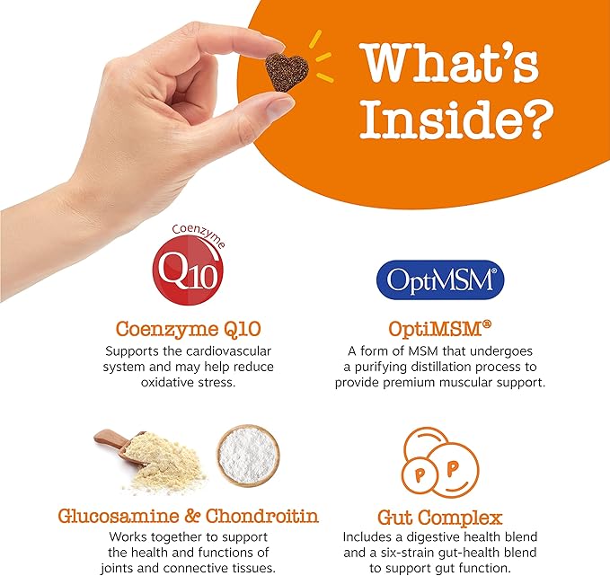 • Hip, Joint & Performance Support - Each dog chew features OptiMSM, a premium form of MSM for muscular support, which works synergistically with the Glucosamine HCl and Chondroitin Sulfate in these chews for hip and joint support plus Cod Liver Oil and B-Complex Vitamins support normal physical performance.