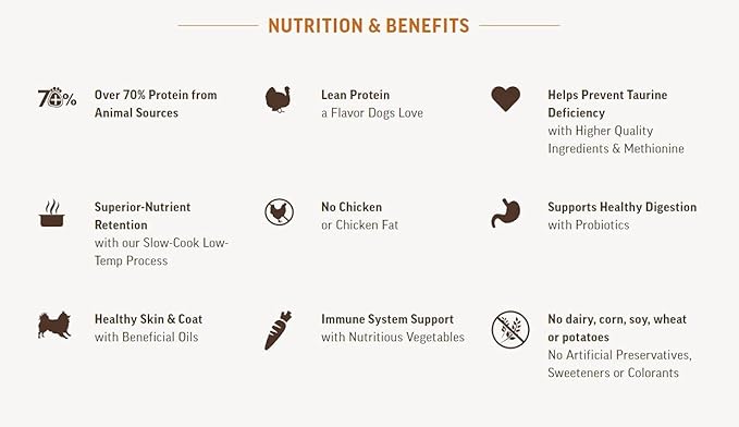 • Our dog kibble is made with a unique low-temperature, slow-cooking process that helps retain high levels of proteins, vitamins and minerals