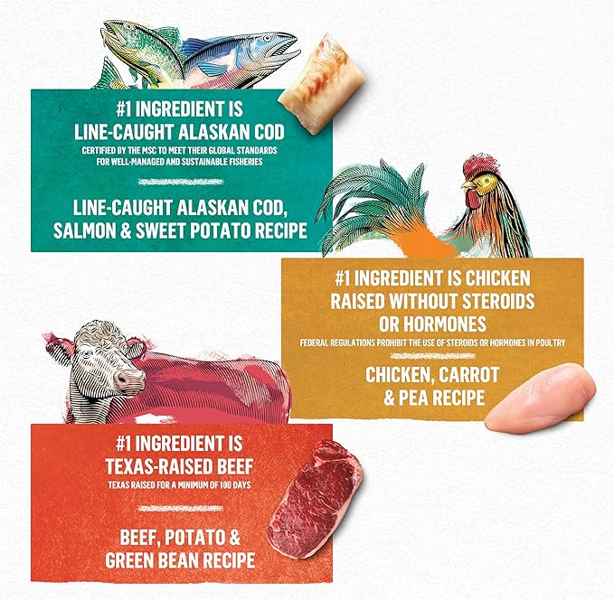 • Texas Beef, Potato and Green Bean dog food dry recipe starts with Texas beef as the number 1 ingredient (Texas-raised for a minimum of 100 days)