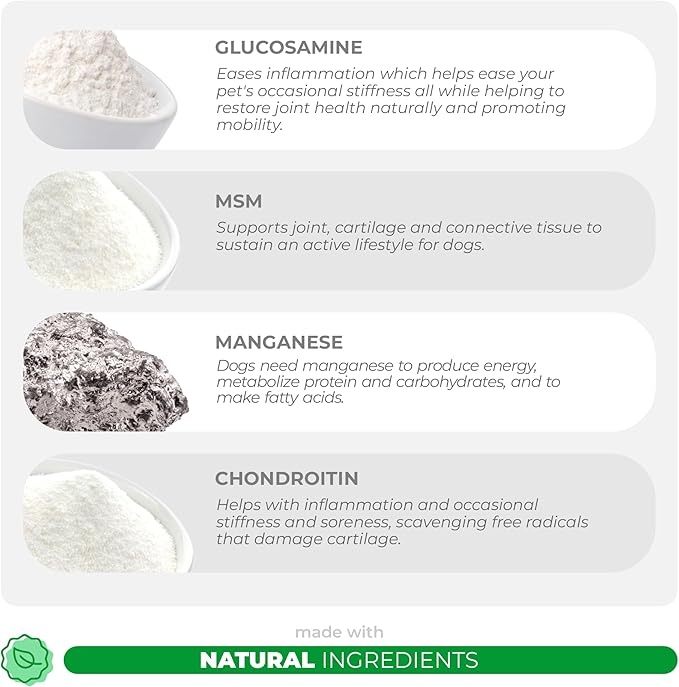 • Powerful Formula - Our dog joint supplements contain Chondroitin which facilitates the absorption of nutrients which promotes cartilage synthesis, while also being an antioxidant and cell rejuvenator.