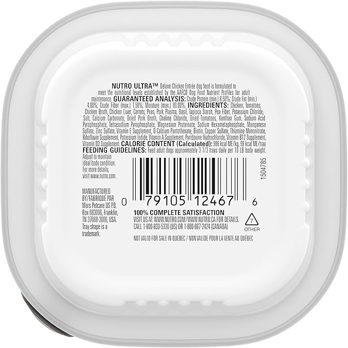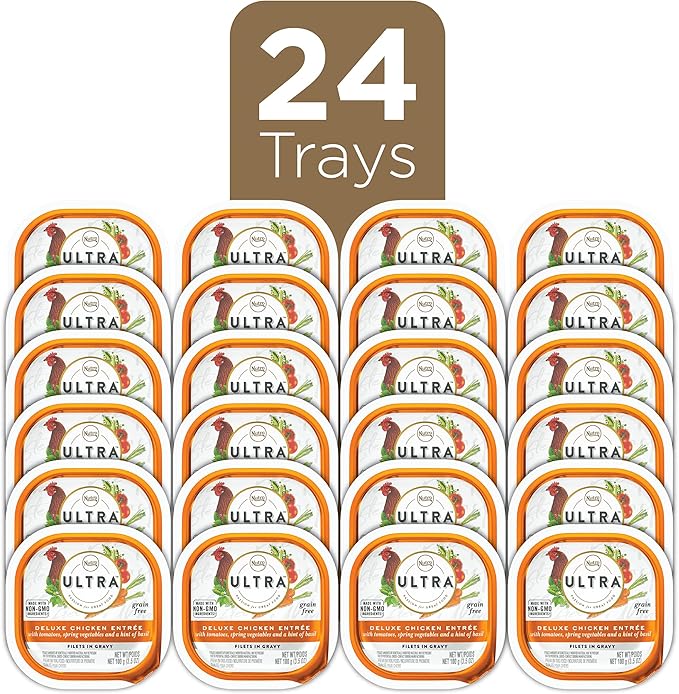 • Contains twenty-four (24) 3.5 oz. trays of NUTRO ULTRA Grain Free Adult Wet Dog Food Filets in Gravy Deluxe Chicken Entrée With Tomatoes, Spring Vegetables, and a Hint of Basil