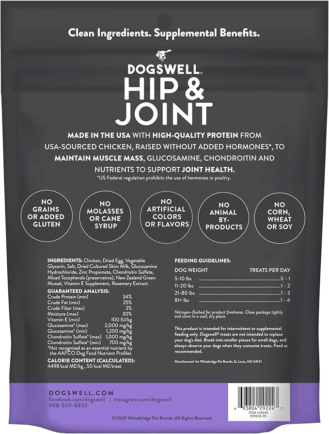 DOGSWELL Hip & Joint Dog Treats 100% Meaty, Grain Free, Glucosamine Chondroitin & Omega 3, Chicken Soft Strips 12 oz