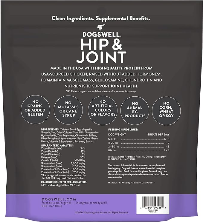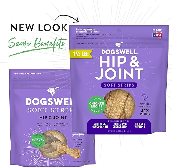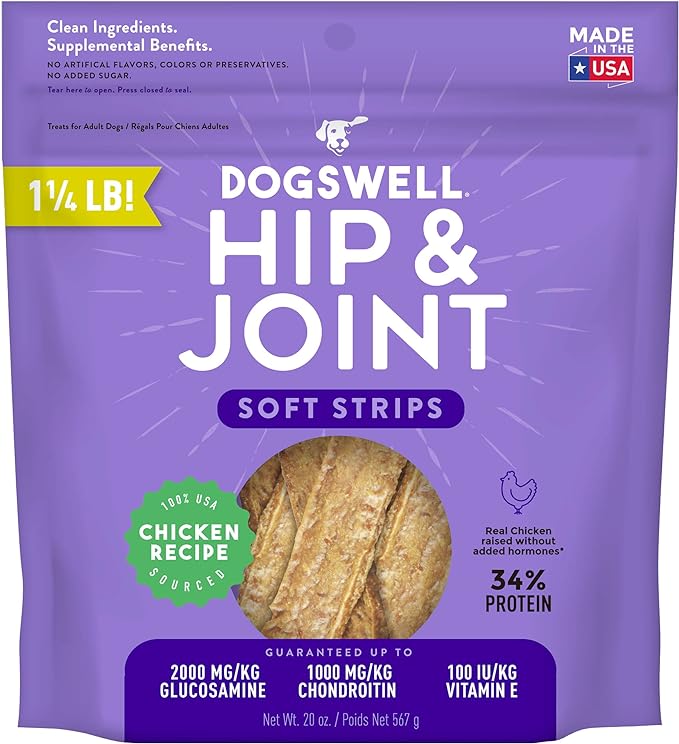 DOGSWELL Hip & Joint Dog Treats 100% Meaty, Grain Free, Glucosamine Chondroitin & Omega 3, Chicken Soft Strips 20 oz