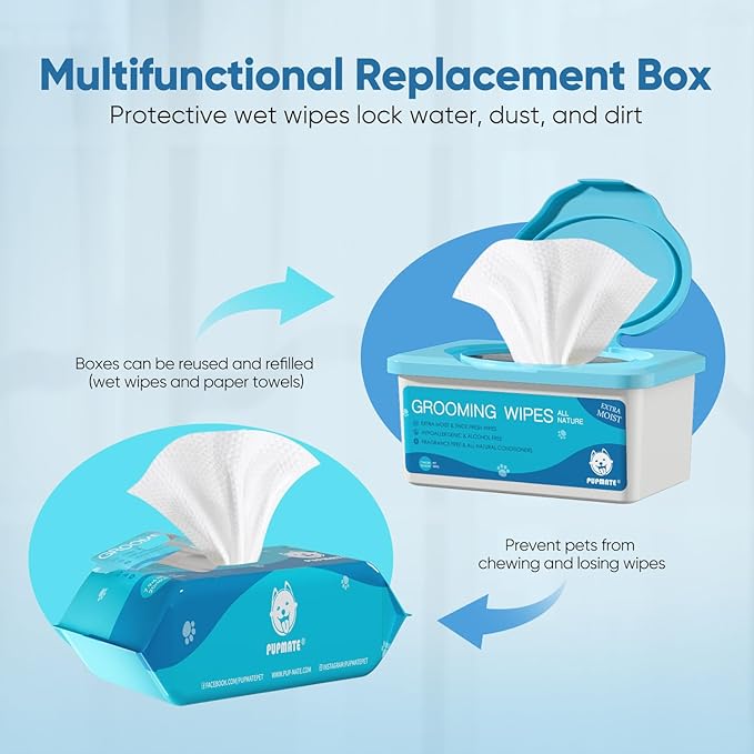 • CONVENIENT STORAGE AND DISTINCTIVE BOX DESIGN: The PUPMATE experience is about convenience, and our pet wipes exemplify this principle. Encased in a moisture-sealed box that shields them from dust and light, they're primed for use at a moment's notice. Be it your adventures outdoors or cozy moments at home, our dog wet wipes take on the role of unwavering protectors, an indispensable resource for your pet's joy.
