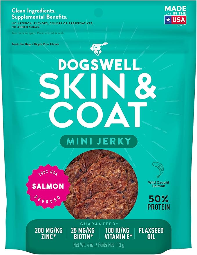 Dogswell Jerky Skin and Coat – Mini Salmon Jerky Dog Treats with Dog Skin & Coat Support (4 oz. Salmon)