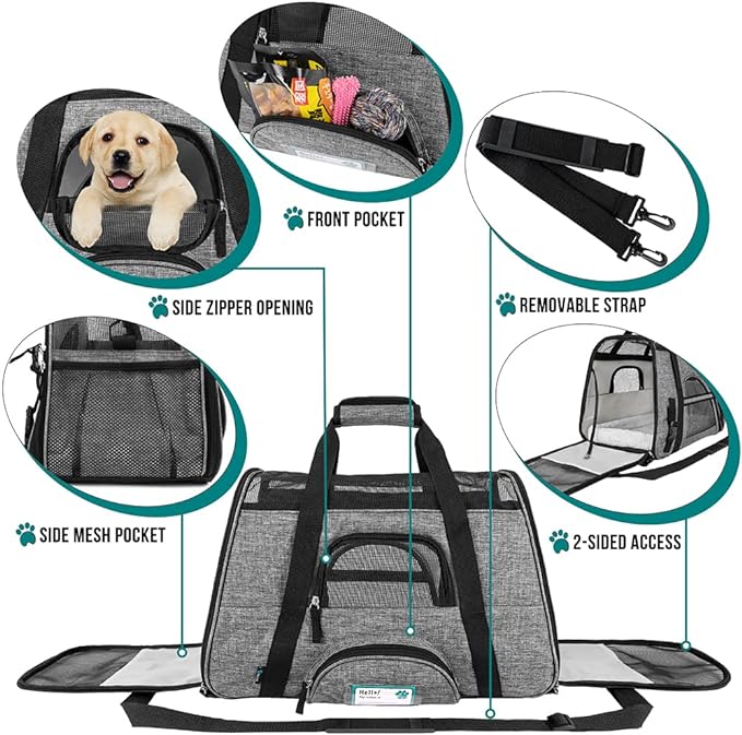 • AIRLINE APPROVED CAT CARRIER: Airline compliant and fits under most airplane seats, this tsa approved pet carrier is easy to carry on in different ways. Besides top handle strap and a removable shoulder strap, the pet travel bag is equipped with side buckles for car seat belt loops. Comes with an identification name tag, and a zipper pocket on the front to store pet stuff, treat, food, toy, or personal items, phone and cards, this soft cat taxi is the most convenient carrier for travels.