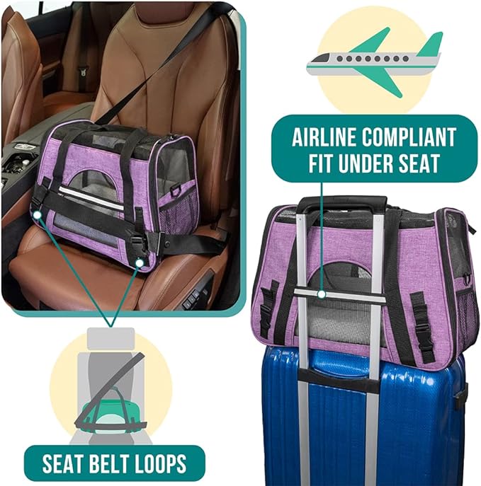 • AIRLINE APPROVED CAT CARRIER: Airline compliant and fits under most airplane seats, this tsa approved pet carrier is easy to carry on in different ways. Besides top handle strap and a removable shoulder strap, the pet travel bag is equipped with side buckles for car seat belt loops. Comes with an identification name tag, and a zipper pocket on the front to store pet stuff, treat, food, toy, or personal items, phone and cards, this soft cat taxi is the most convenient carrier for travels.