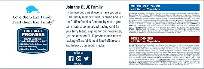• Contains one (1) variety pack of BLUE Homestyle Recipe Natural Adult Wet Dog Food, Chicken & Beef 12.5-oz can (8 count- 4 of each flavor)