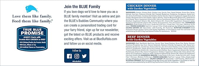 • FEED THREE WAYS: BLUE Homestyle Recipe adult dog food makes a delicious treat, adds interest mixed into their favorite dry foods or can be fed as a meal on its own