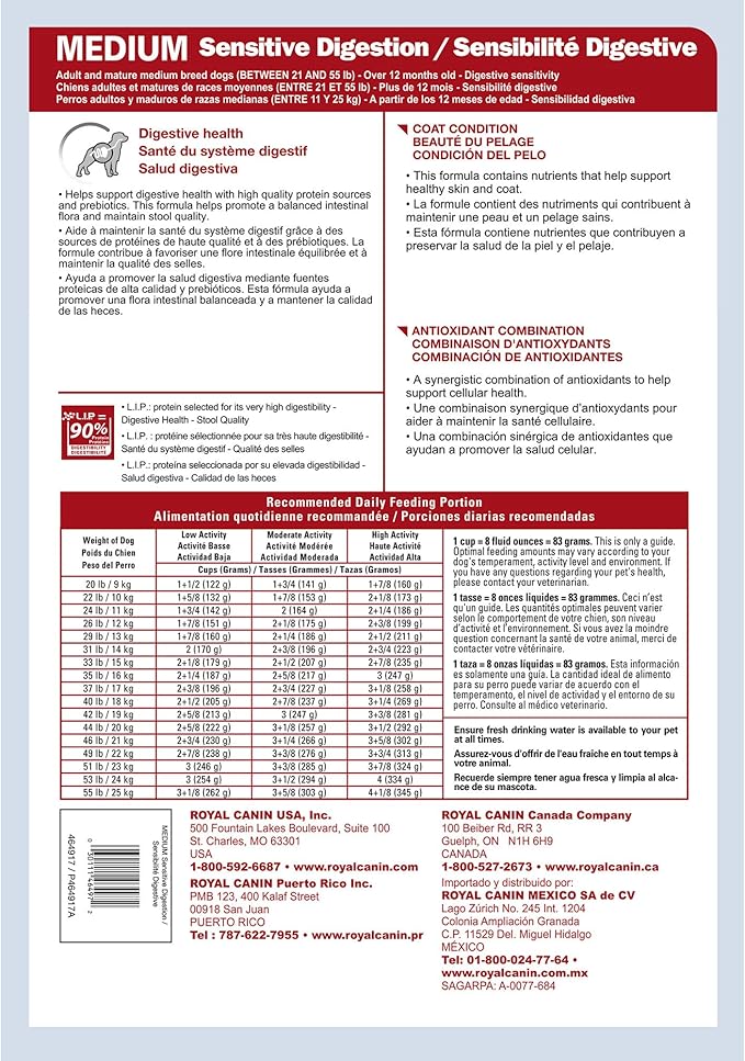 • FOR MEDIUM DOGS WITH SENSITIVE STOMACHS: Royal Canin Medium Digestive Care Dry Dog Food is formulated for medium dogs 12 months and older weighing 23-55 lb with a sensitive stomach