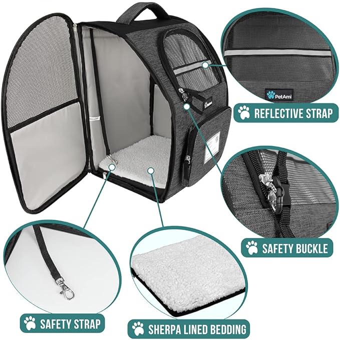 • LARGE ROOMY DOG BACKPACK CARRIER: PetAmi Cat Carrier Backpack measured 12.5" x 10.2" x 16.3" (L x W x H) and is designed for maximum convenience and comfort for your pet and you while hiking, camping, and traveling, or taking your pet, cat to the vet, or dog walking. Easily fit large cats, small medium dogs, and other size pets with Max Weight limit 18 lbs. There are 2 ways to enter from both sides of the backpack carrier and it comes with ample room and bed so your pet travels in comfort.