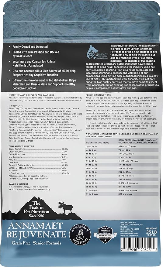 • SILVER CARP: Annamaet Re-juvenate is made with wild caught, sustainable silver carp, These filter feeders are high in Omega 3 Fatty Acids, helping to promote healthy cognitive function in aging dogs, Silver carp are high in protein and low in fat, as seniors require more protein on a calorie basis than young adults