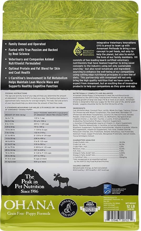 Annamaet Grain-Free Ohana Puppy Formula Dry Dog Food, (Line-Caught Cod & Whitefish), 12-lb Bag